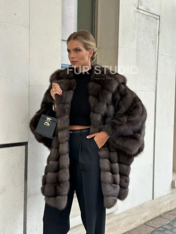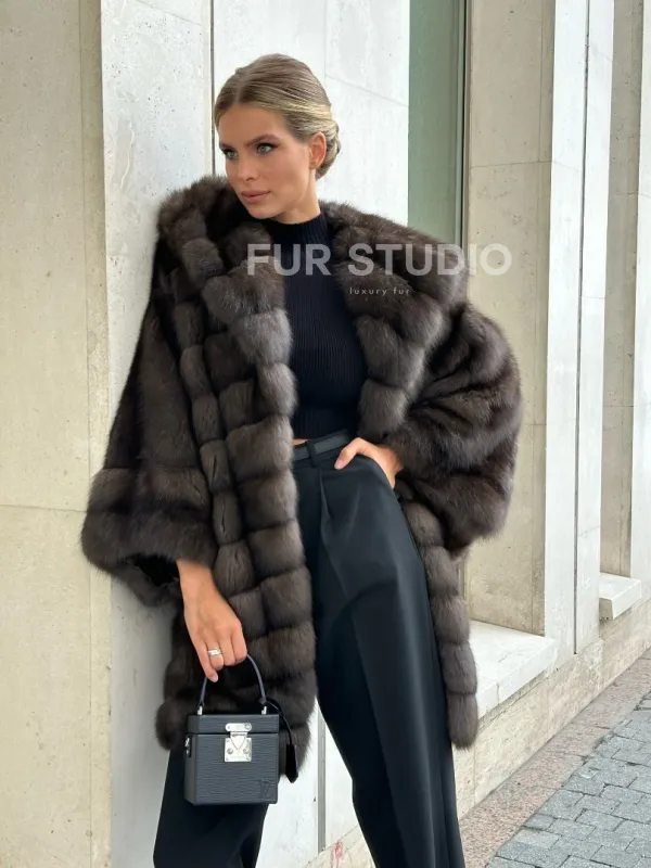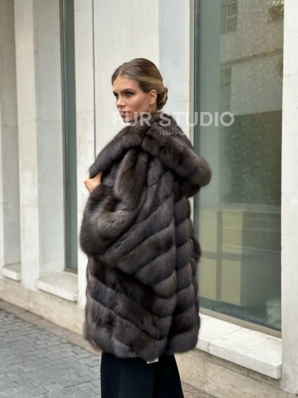 Ждем вас в шоуруме студии меха Fur Studio в Москве. У нас вы сможете примерить и купить жакет из меха соболя с капюшоном и широкими укороченными рукавами.