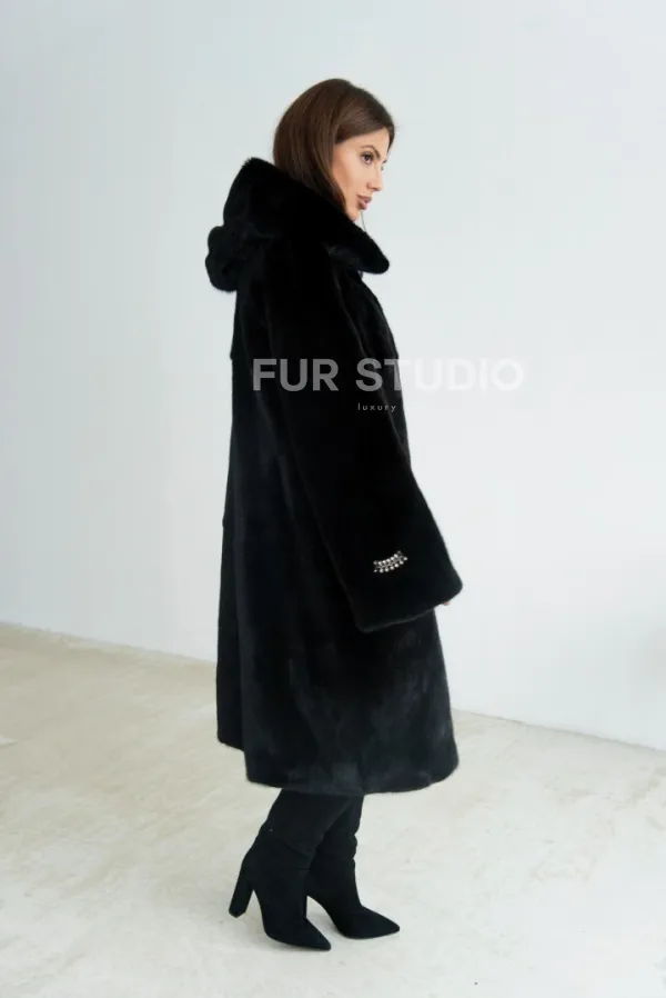 Мех данной шубы норка Blackglama , цвет черный. Предлагается в размерах от 48 до 52. Длина модели 105-110 см, что выгодно подчеркивает фигуру девушек. Эта модель идеально подойдет для девушек и женщин, предпочитающих роскошные натуральные меха.