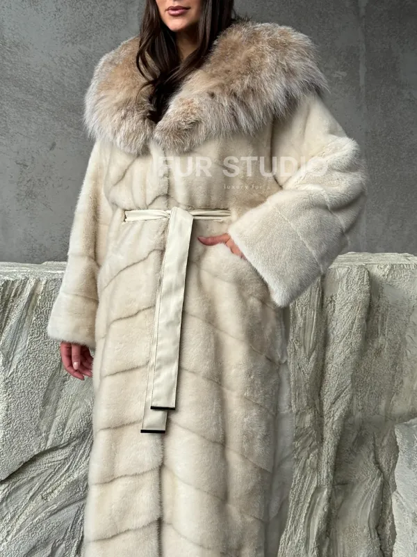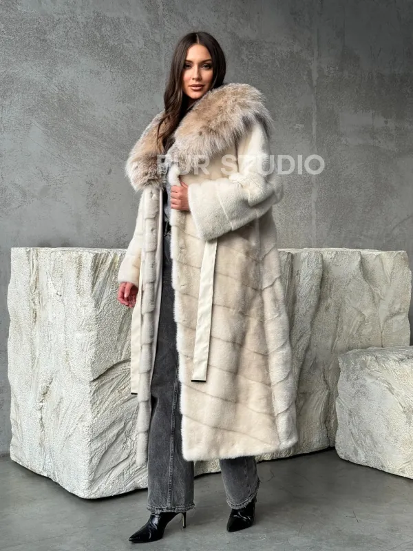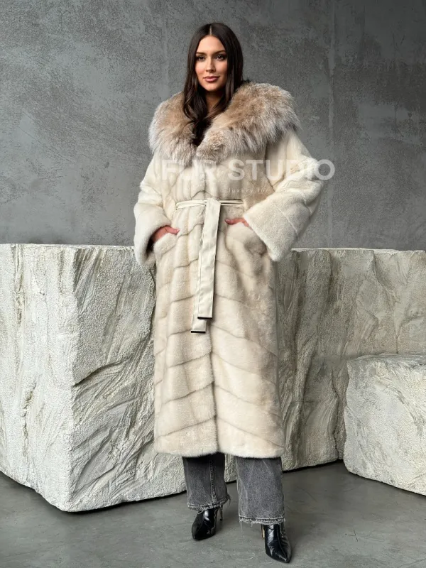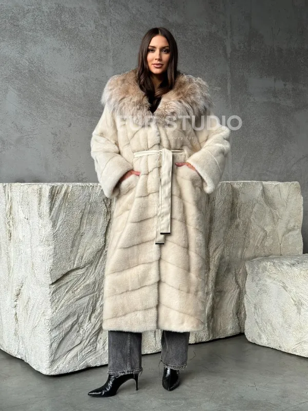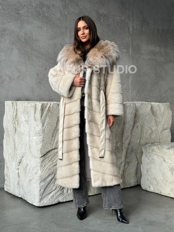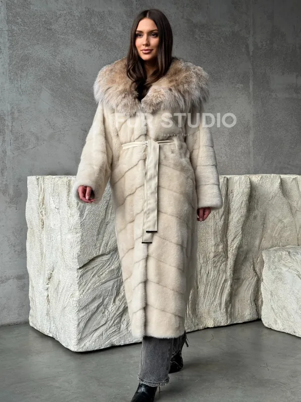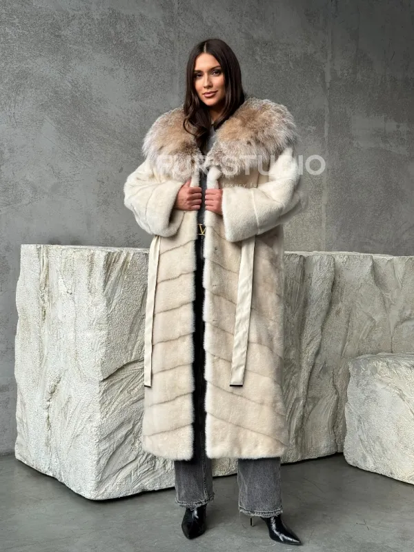 Мех данной шубы аукционная норка, цвет бежевый. Предлагается в размерах от 42 до 48. Длина модели 125-130 см, что выгодно подчеркивает фигуру девушек. Эта модель идеально подойдет для девушек и женщин, предпочитающих роскошные натуральные меха.