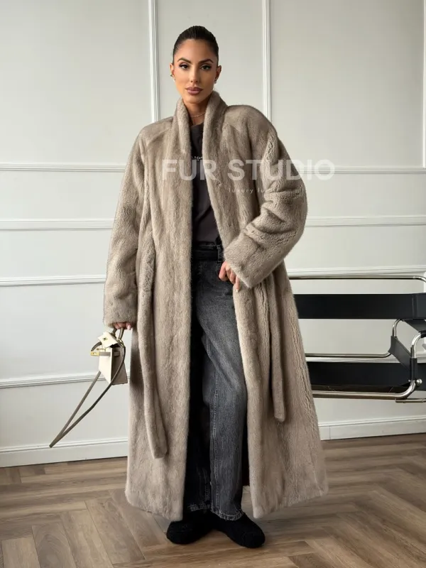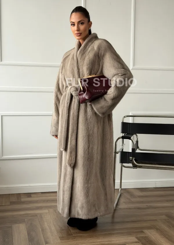 Мех данной шубы аукционная норка, цвет серый. Предлагается в размерах от 42 до 52. Длина модели 125-130 см, что выгодно подчеркивает фигуру девушек. Эта модель идеально подойдет для девушек и женщин, предпочитающих роскошные натуральные меха.