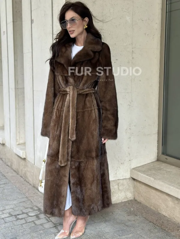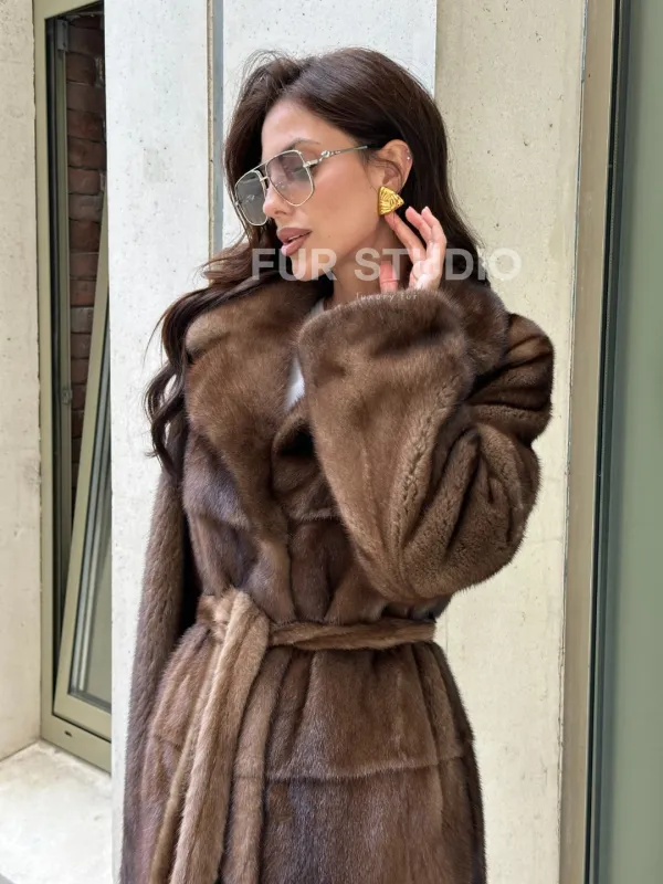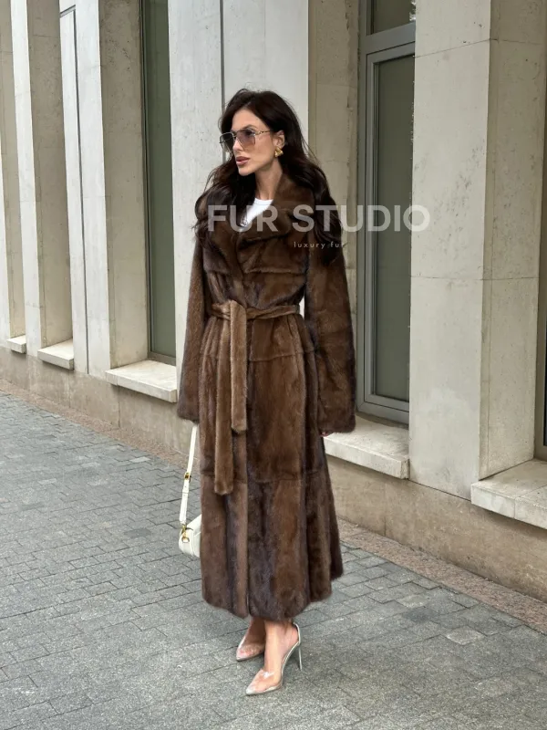 Мех данной шубы аукционная норка, цвет коричневый. Предлагается в размерах от 42 до 50. Длина модели 125-130 см, что выгодно подчеркивает фигуру девушек. Эта модель идеально подойдет для девушек и женщин, предпочитающих роскошные натуральные меха.