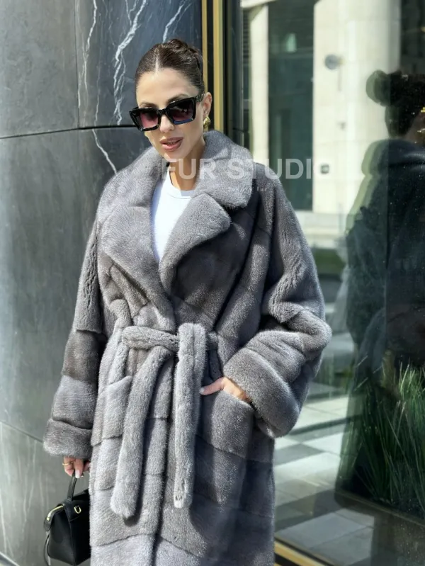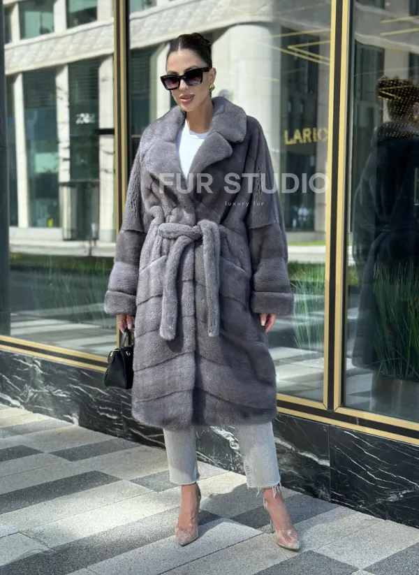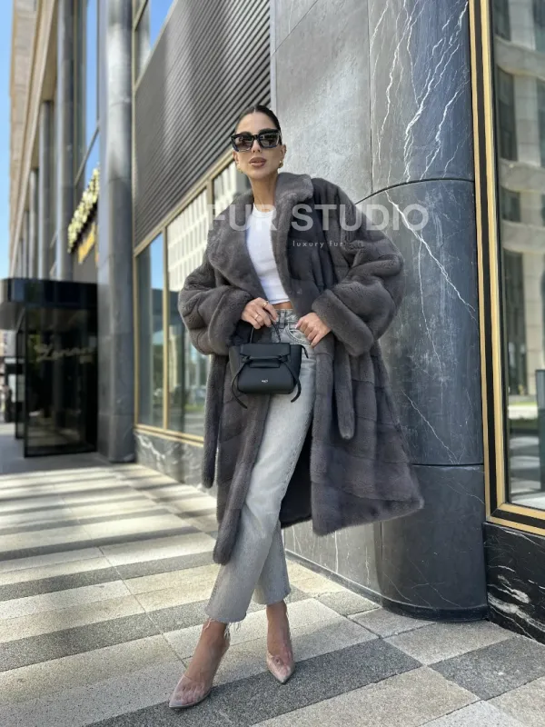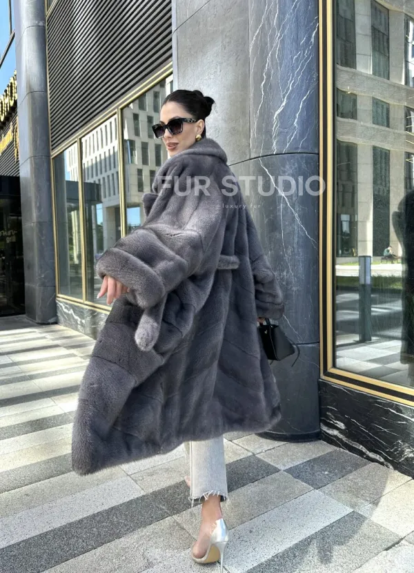 Мех данной шубы аукционная норка , цвет серый. Предлагается в размерах от 42 до 52. Длина модели 110-115 см, что выгодно подчеркивает фигуру девушек. Эта модель идеально подойдет для девушек и женщин, предпочитающих роскошные натуральные меха.