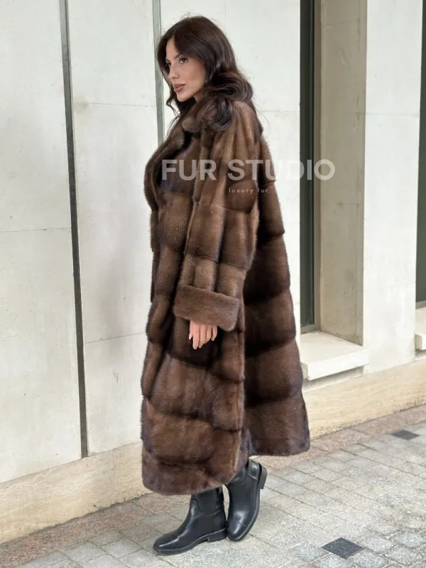 Мех данной шубы аукционная норка, цвет коричневый. Предлагается в размерах от 42 до 66. Длина модели 115-120 см, что выгодно подчеркивает фигуру девушек. Эта модель идеально подойдет для девушек и женщин, предпочитающих роскошные натуральные меха.