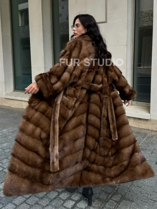 Прямой крой зрительно увеличит рост и скроет недостатки фигуры. Меховой пояс выгодно очертит талию и создаст силуэт песочных часов. В шубе вы будете выглядеть женственно и лаконично. Широкие манжеты подчеркнут изящество кистей. Купить норковую шубу в цвете соболь с английским воротником могут девушки, которые разбираются в моде и имеют безукоризненный вкус.