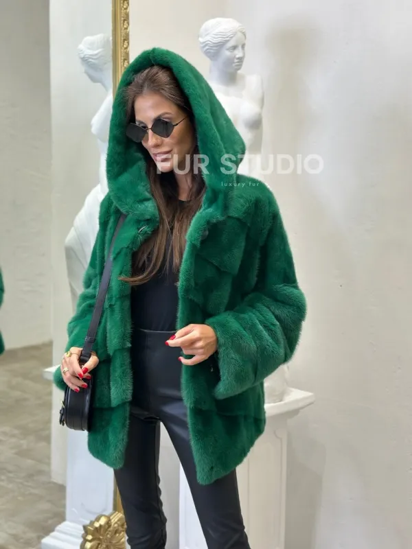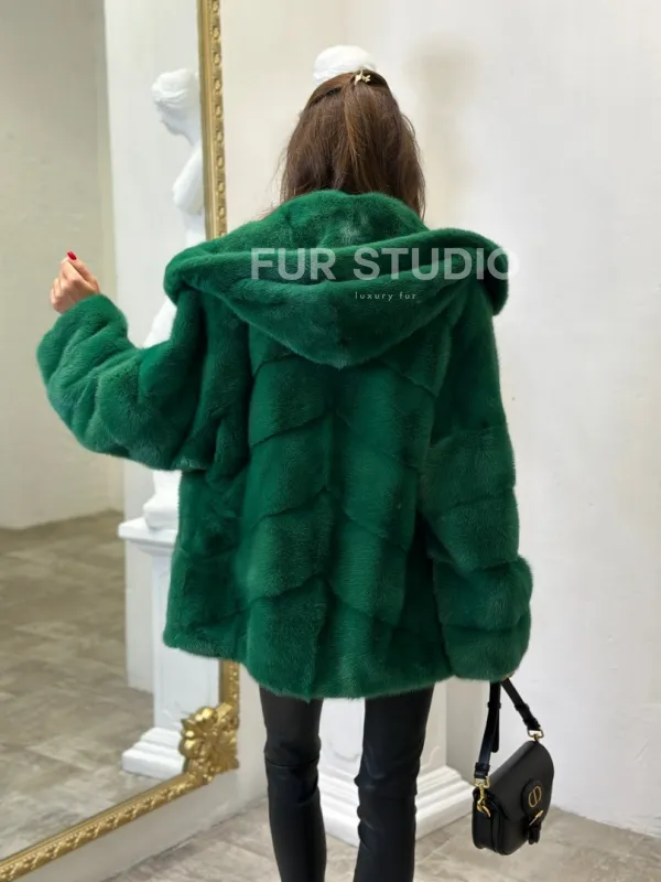 Норковый полушубок с капюшоном - цвет изумруд 100608