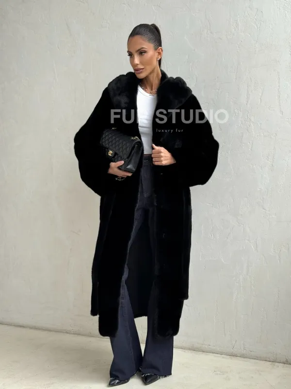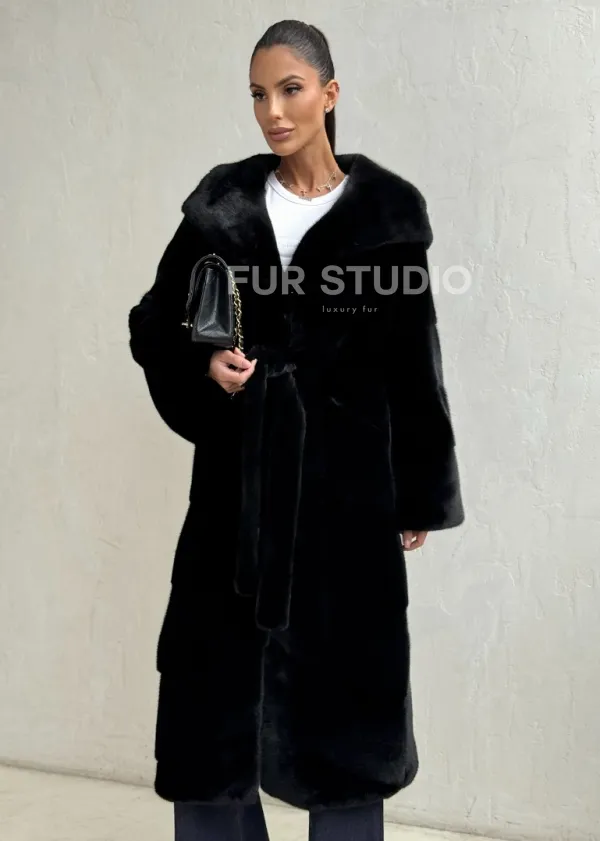 Мех данной шубы норка Blackglama , цвет черный. Предлагается в размерах от 42 до 50. Длина модели 115-120 см, что выгодно подчеркивает фигуру девушек. Эта модель идеально подойдет для девушек и женщин, предпочитающих роскошные натуральные меха.