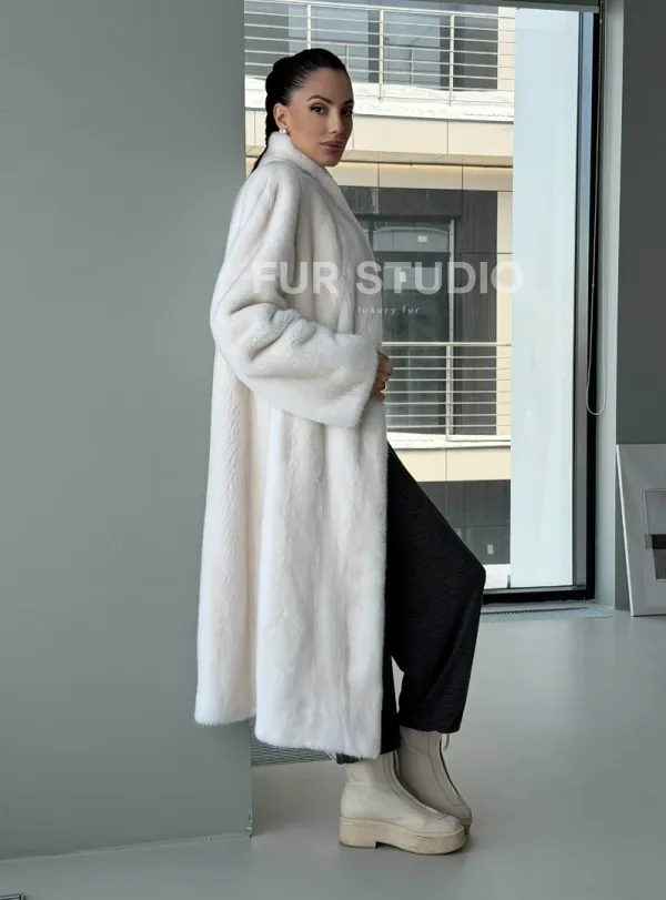 Мех данной шубы аукционная норка, цвет белый. Предлагается в размерах от 42 до 50. Длина модели 115-120 см, что выгодно подчеркивает фигуру девушек. Эта модель идеально подойдет для девушек и женщин, предпочитающих роскошные натуральные меха.