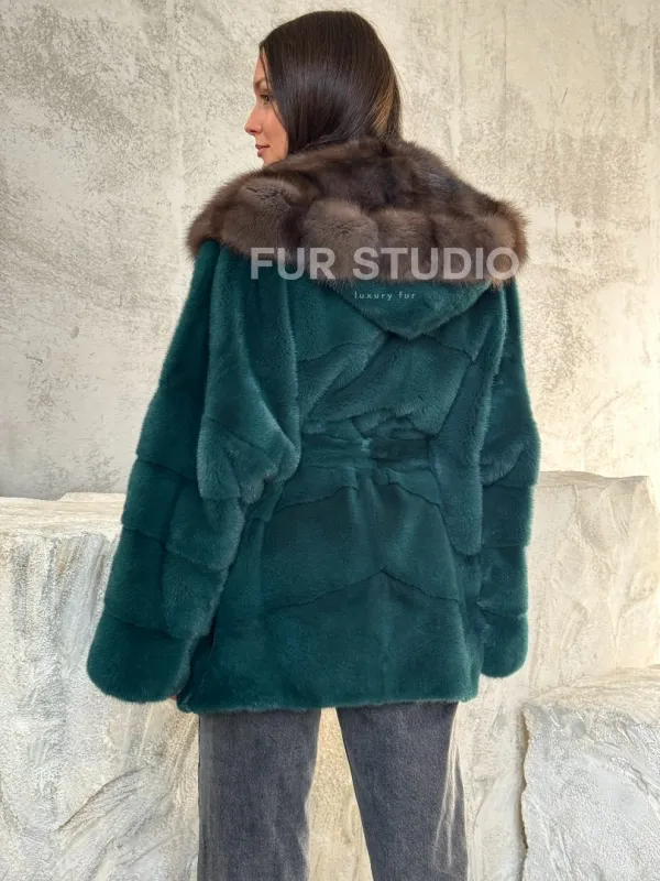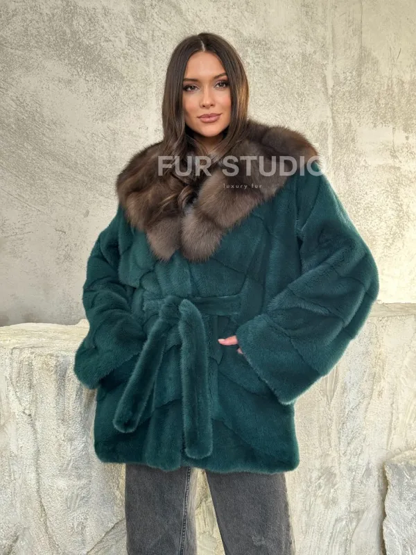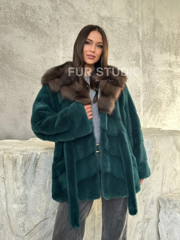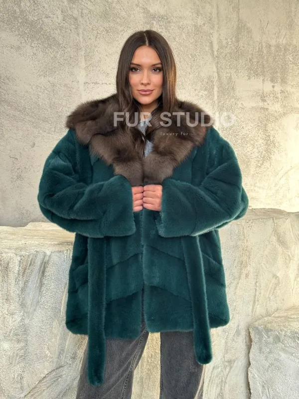 Мех данной шубы аукционная норка, цвет зеленый. Предлагается в размерах от 42 до 50. Длина модели 75-80 см, что выгодно подчеркивает фигуру девушек. Эта модель идеально подойдет для девушек и женщин, предпочитающих роскошные натуральные меха.