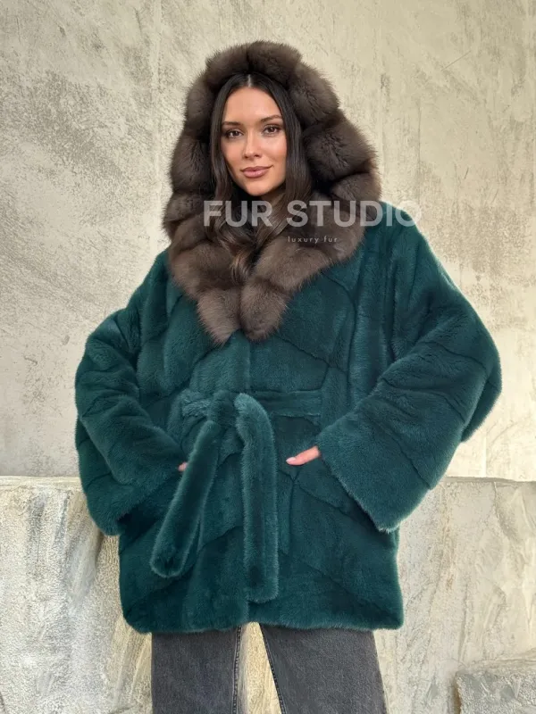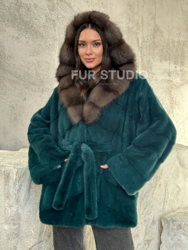 Шуба норка кимоно - капюшон куница 102513