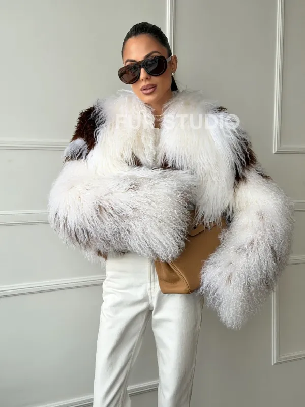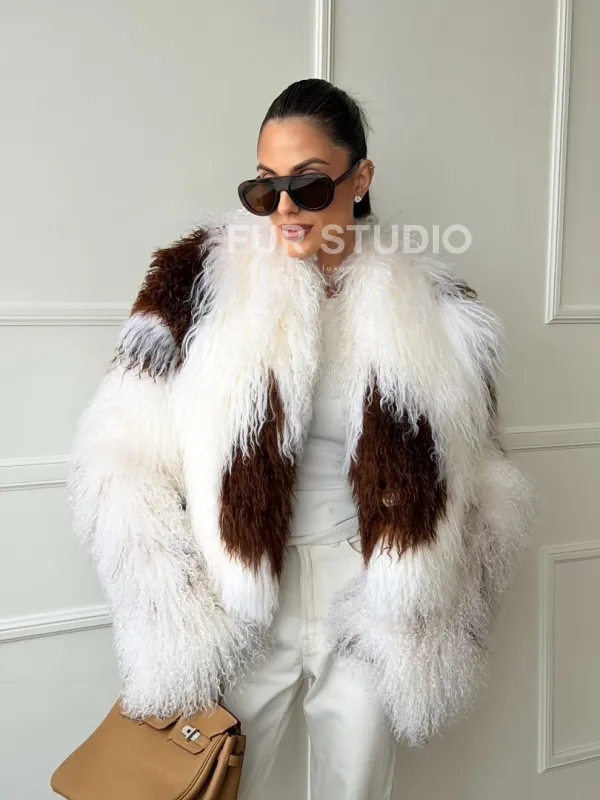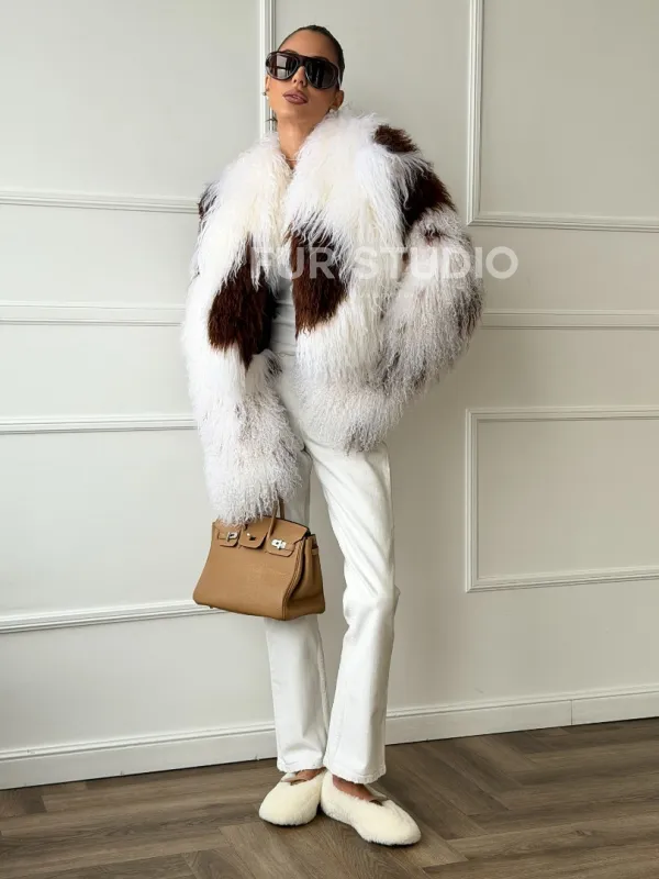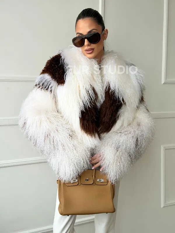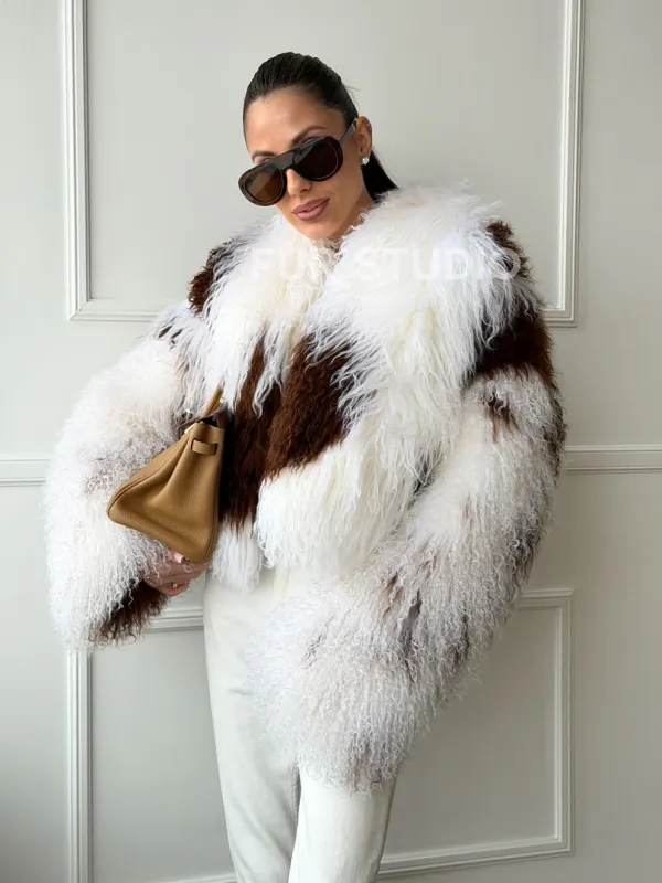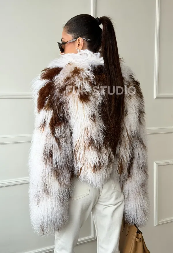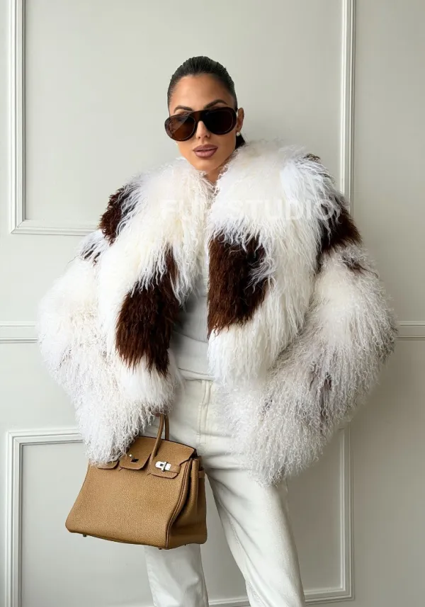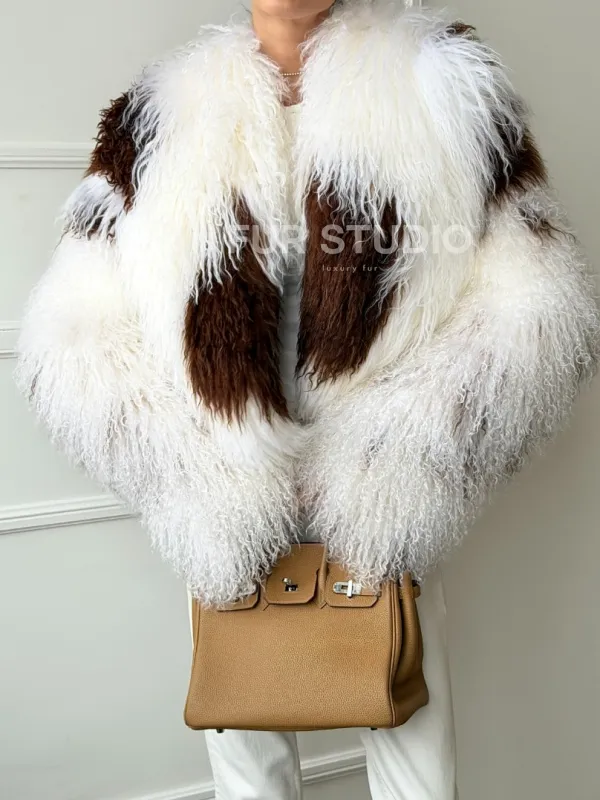 Шубка из ламы бело-коричневая 102654